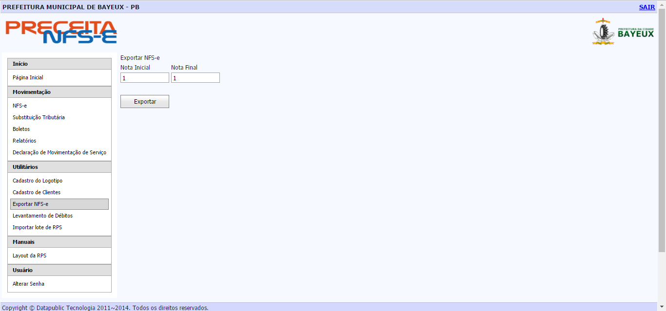 Através do menu ”UTILITÁRIOS => Exportar NFS-e” o usuário é redirecionado para uma tela onde pode ser informado um “Range” de NFS-e para download ou apenas a NFS-e desejada, no entanto devem ser preenchidos os 2 campos “Nota Inicial e Nota Final” presentes na tela.