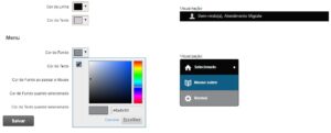 Para configurar as cores deve-se clicar no quadro que exibe a cor, como demonstra a imagem abaixo. Então será aberta uma nova tela com todas as cores disponíveis para configuração. O usuário poderá definir a cor de fundo e cor da fonte para a barra superior da aplicação, e ainda as cores de fundo, fonte e seleção do Menu.