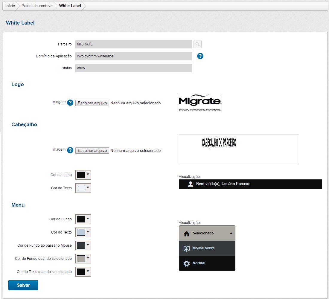 Através da nova opção White Label é possível adicionar a logomarca do Parceiro, definir uma imagem de fundo personalizada no cabeçalho, configurar a cor da fonte e cor de fundo da barra superior da aplicação, personalizar as cores do menu lateral (cor de fonte, cor de fundo, cores conforme efeito de seleção do menu), e ainda definir uma URL própria para acesso a aplicação.