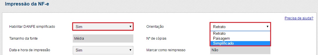 Após configurar o parâmetro ‘Habilitar DANFE simplificado’ para Sim, no campo ‘Orientação’ estará disponível a opção Simplificado. A partir disso, o DANFE das NF-e emitidas poderá ser impresso de forma simplificada.