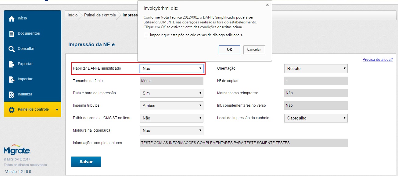 Para habilitar essa nova configuração acesse o Painel de Controle, e no grupo NF-e a opção ‘Impressão’. Para habilitar a impressão do DANFE Simplificado é necessário configurar o parâmetro ‘Habilitar DANFE simplificado’, como destacado na imagem abaixo. Ao selecionar a opção ‘Sim’ aparecerá uma mensagem em tela alertando o usuário sobre a impressão simplificada.