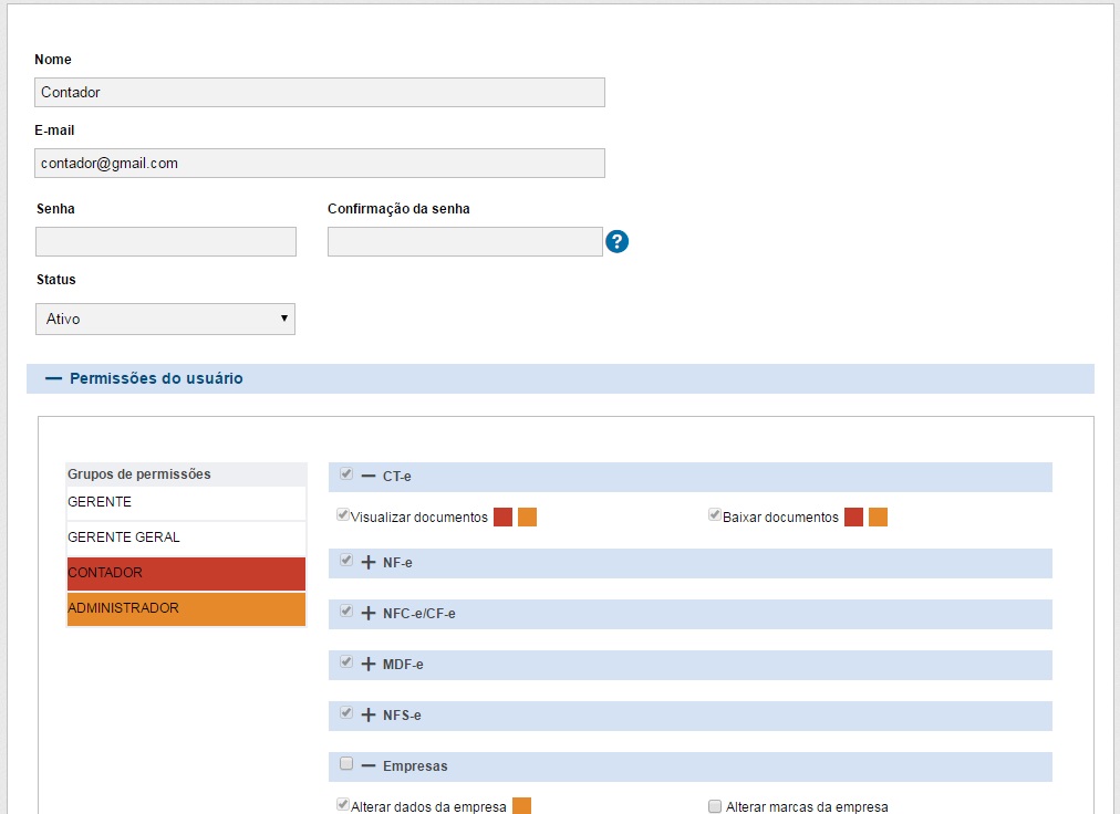 Agora, suponhamos que você cadastre o usuário contador e vincule com todas as suas empresas. Mas para a empresa Matriz você deseja liberar mais algumas permissões para ele, então você acessa a tela de usuários da empresa Matriz e altera o usuário contador, configurando as permissões desejadas.