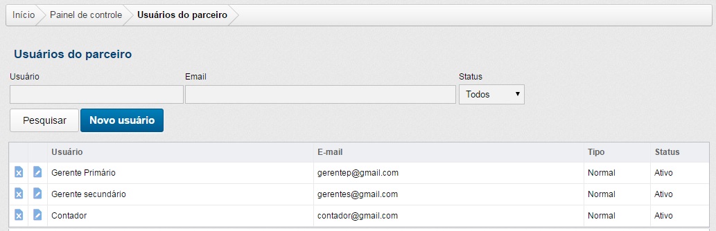 Na tela serão listados todos os usuários cadastrados para o parceiro, com a possibilidade de excluir, editar e ainda cadastrar um novo usuário, como demonstra a tela abaixo.