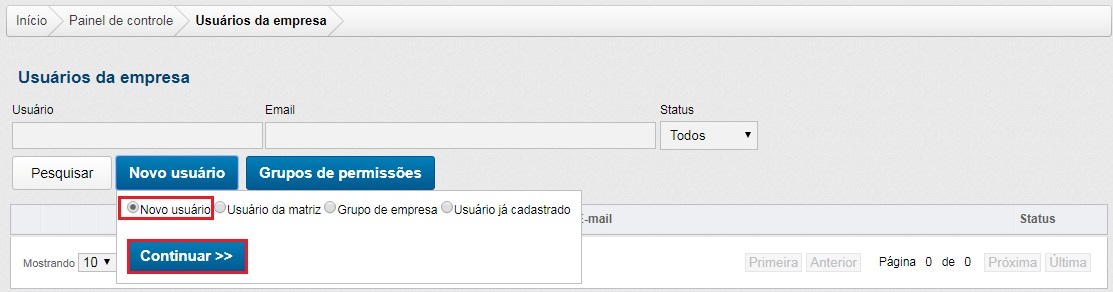 – Novo usuário: será a opção padrão, onde o parceiro poderá cadastrar um novo usuário normalmente, selecionando a opção ‘Novo usuário’ e clicando no botão ‘Continuar’, como demonstra a imagem abaixo.