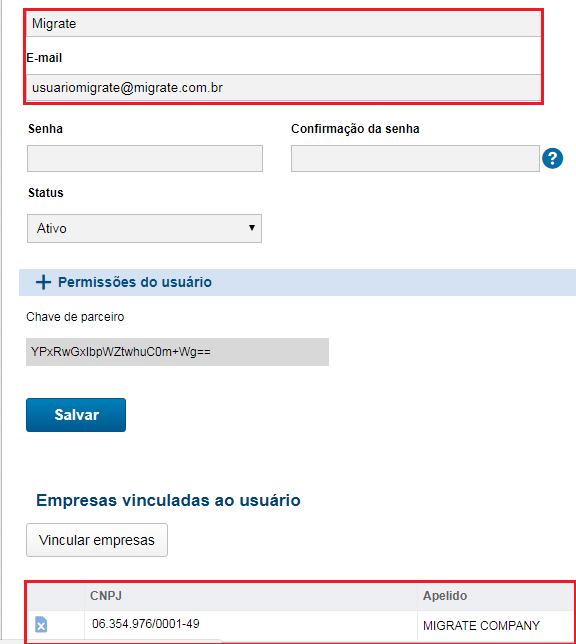 Ao cadastrar um usuário pela nova tela de usuários do parceiro, e fazer o vínculo com as empresas, automaticamente o mesmo aparecerá na tela de usuários da empresa para a qual foi vinculado. Sendo assim, sempre que o usuário sofrer alguma alteração através da tela de usuários do parceiro, a mesma será replicada para o usuário de cada empresa em específico.