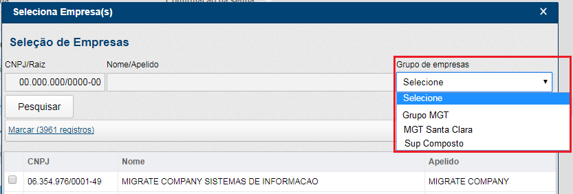 Será aberta uma tela com a listagem das empresas do parceiro. Através do ‘Grupo de empresas’ pode-se selecionar o grupo de empresas desejado e clicando em ‘Pesquisar’ serão apresentadas em tela apenas as empresas pertencentes ao grupo. Selecione a empresa que deseja vincular ao usuário e aplique a seleção.