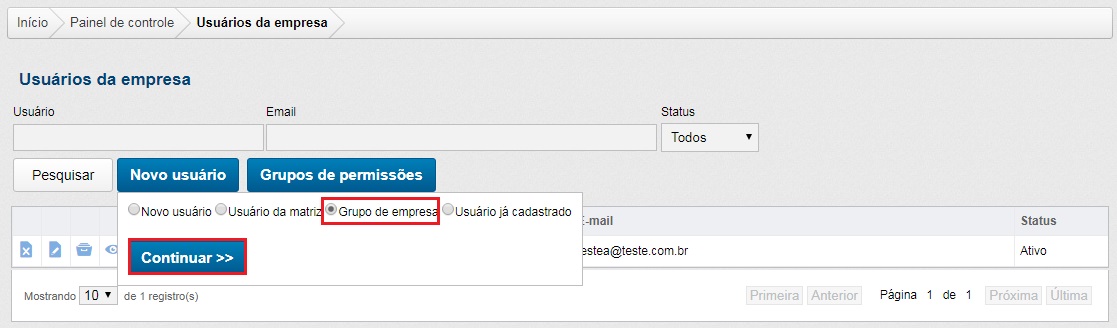 – Usar usuários do grupo de empresa: essa opção estará disponível apenas quando a empresa pertencer a um grupo de empresas. Ao selecionar essa opção serão copiados os usuários de todas as empresas que também estiverem vinculadas ao mesmo grupo de empresas.