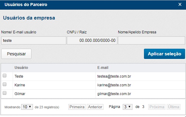 – Usar usuários já cadastrados: essa opção estará disponível apenas quando o usuário parceiro possuir usuários cadastrados. Ao selecionar a opção “Usuário já cadastrado” será apresentada uma lista com todos os usuários cadastrados para o parceiro, como demonstra a imagem abaixo, permitindo assim vincular esses usuários para a nova empresa a ser cadastrada.
