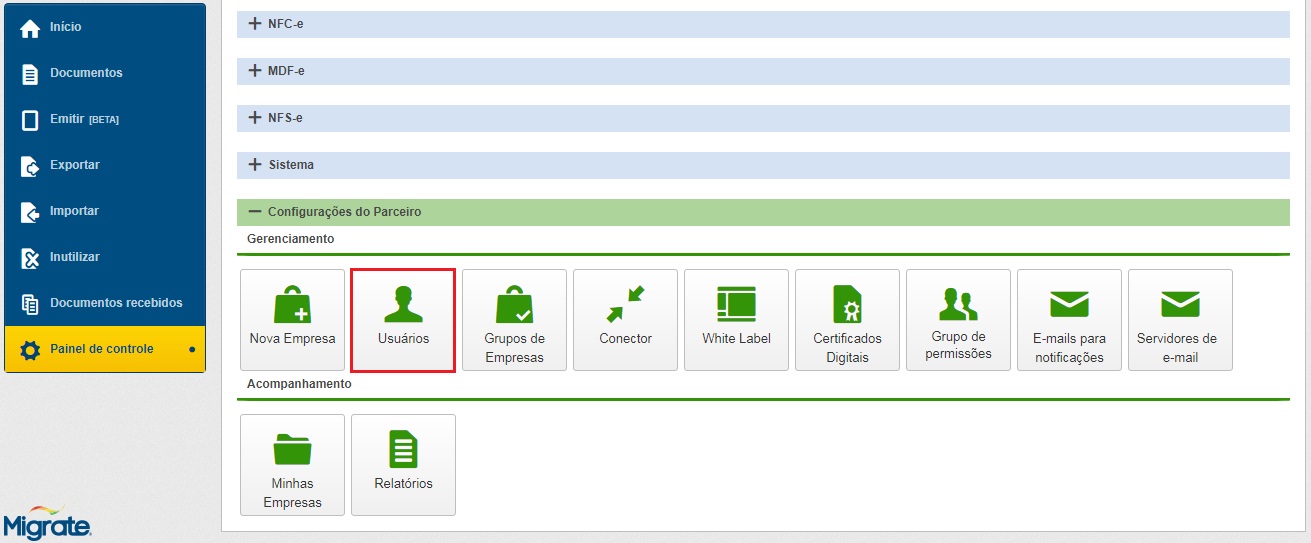 Essa funcionalidade está disponível no Painel de Controle, grupo ‘Configurações do Parceiro’, opção ‘Usuários’, como demonstra a imagem a seguir.