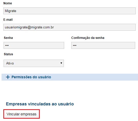 Após configurar as permissões de acesso e salvar o usuário, deve-se vincular as empresas ao usuário. Destacando que o usuário terá acesso a todas as empresas que forem vinculadas. Utilize o botão ‘Vincular empresas’, para realizar o vínculo das empresas ao usuário cadastrado.