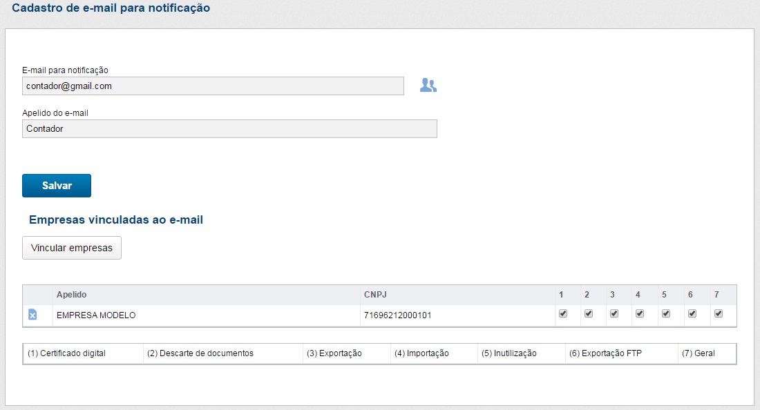 Você poderá cadastrar um novo endereço de e-mail, ou utilizar o e-mail de um usuário já existente na aplicação. Após salvar o cadastro do e-mail, você pode vincular o mesmo a várias empresas, e definir quais os tipos de notificação que esse e-mail irá receber sobre cada empresa. A imagem abaixo demonstra essas funcionalidades.