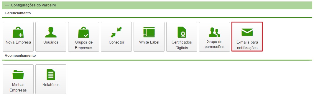 Para acessar essa nova tela basta ir até o Painel de controle, grupo ‘Configurações do Parceiro’, opção ‘E-mails para notificações’, como demonstra a imagem abaixo.
