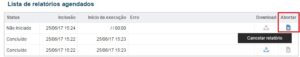 Também foi adicionada uma opção que possibilita abortar a geração de um relatório. Caso o usuário solicite a geração de um relatório e por algum motivo precise cancelar o processo, se o relatório não tiver sido gerado ainda e estiver com status ‘Não iniciado’, poderá abortar a geração deste relatório. Veja na imagem abaixo a opção de abortar.