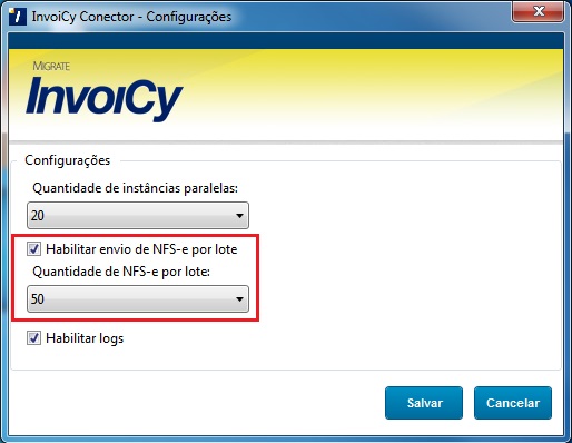 Através dessa tela é possível habilitar o envio de NFS-e em lote, bem como definir a quantidade de NFS-e que será enviada por lote. A imagem abaixo destaca essas configurações.