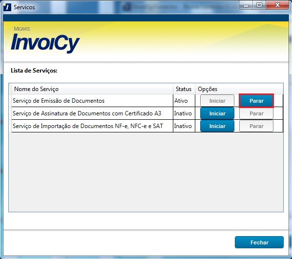 Ao clicar no botão ‘OK’, será aberta a tela dos serviços, para que você usuário se certifique que todos os serviços estejam parados. Caso algum serviço esteja rodando, clique no botão ‘Parar’, como demonstra a imagem.