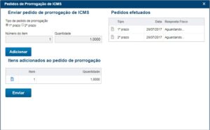 Na sequência será aberta a tela para preencher as informações e enviar o pedido de prorrogação. Você deverá selecionar o tipo de pedido: 1º prazo ou 2º prazo, informar o número do item e quantidade, e por fim clicar no botão ‘Adicionar’. Na tabela, abaixo da descrição ‘Itens adicionados ao pedido de prorrogação’, serão exibidas as suas informações. Ao clicar no botão ‘Enviar’ o pedido será enviado para a SEFAZ, aparecendo na grid ao lado ‘Pedidos efetuados’. A imagem a seguir demonstra a funcionalidade da tela.