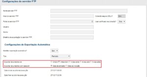 8107 – Exportação de documentos via FTP: disponibilizamos dois novos parâmetros para empresas que utilizam a exportação automática de documentos via FTP, quando o tipo de exportação for por período: o campo ‘Exportar documentos de’ com as opções ‘Ontem, Anteontem, 3 dias atrás, 4 dias atrás e 5 dias atrás’, e também o campo ‘Exportar documentos com base em’, com as opções ‘Data de emissão e Data de inclusão’, conforme pode ser observado na imagem abaixo.