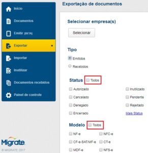 8147 – Melhoria nos filtros da tela de exportação: para melhorar a usabilidade do sistema para os usuários, na tela de exportação incluímos a opção ‘Todos’ ao lado dos grupos de ‘Status’ e ‘Modelo’, onde ao clicar nessa opção todas as demais opções desses grupos serão selecionadas. Veja na imagem abaixo como ficou essa alteração na tela.