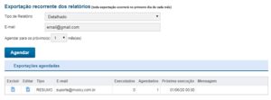 Os agendamentos podem ser consultados na lista de exportações agendadas, onde constam as informações de que tipo é o relatório, para qual e-mail ele será enviado, quantos relatórios já foram executados, e quantos relatórios mensais faltam, assim como a data da próxima execução.