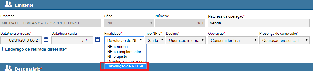 Agora, a tela de digitação permite também referenciar uma NFC-e para uma nota de devolução. Para realizar essa ação o usuário deve selecionar no campo “Finalidade” a opção “Devolução de NFC-e”.