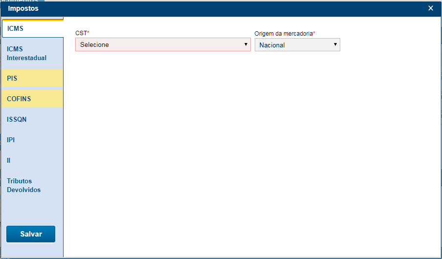 Nas informações dos impostos, as abas que forem de maior importância e obrigatórias estarão destacadas em amarelo. A imagem a seguir demonstra as abas destacadas.