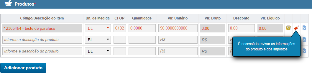 Caso um produto ainda não tenha sido utilizado para a UF ou para o destinatário da nota em digitação, ou seja um produto novo, esse produto ficará destacado em vermelho para que o usuário lembre-se de revisar detalhes importantes do item. Na imagem a seguir, um exemplo de como o produto ficará quando destacado.