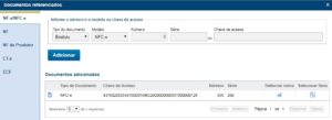 No grupo ‘Documentos Referenciados’ deve-se selecionar a aba ‘NF-e/NFC-e’, e informar o tipo do documento, Modelo (no caso NFC-e), número e série, ou a chave de acesso. Ao clicar no botão ‘Adicionar’ os documentos adicionados serão listados abaixo.