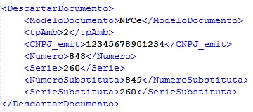 Agora, ao enviar o descarte deve-se informar no campo nNFSubstituta e serieSubstituta, o número e série do documento que irá substituir o documento descartado. Veja na imagem abaixo o novo layout de integração.