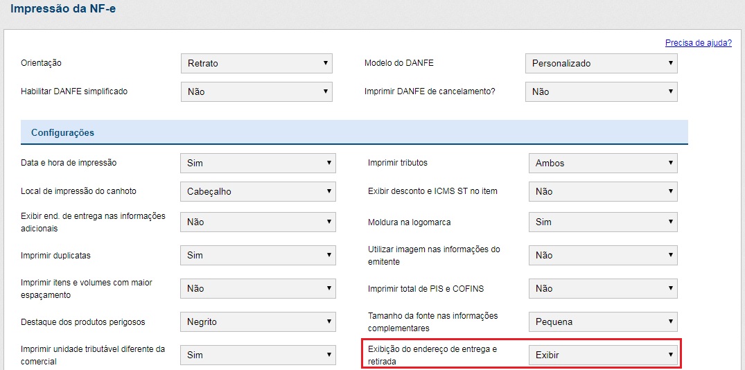 Foi criado um novo parâmetro na tela de configurações de impressão da NF-e para exibir os novos grupos de retirada e entrega no DANFE personalizado. Veja na imagem abaixo em destaque o novo parâmetro.