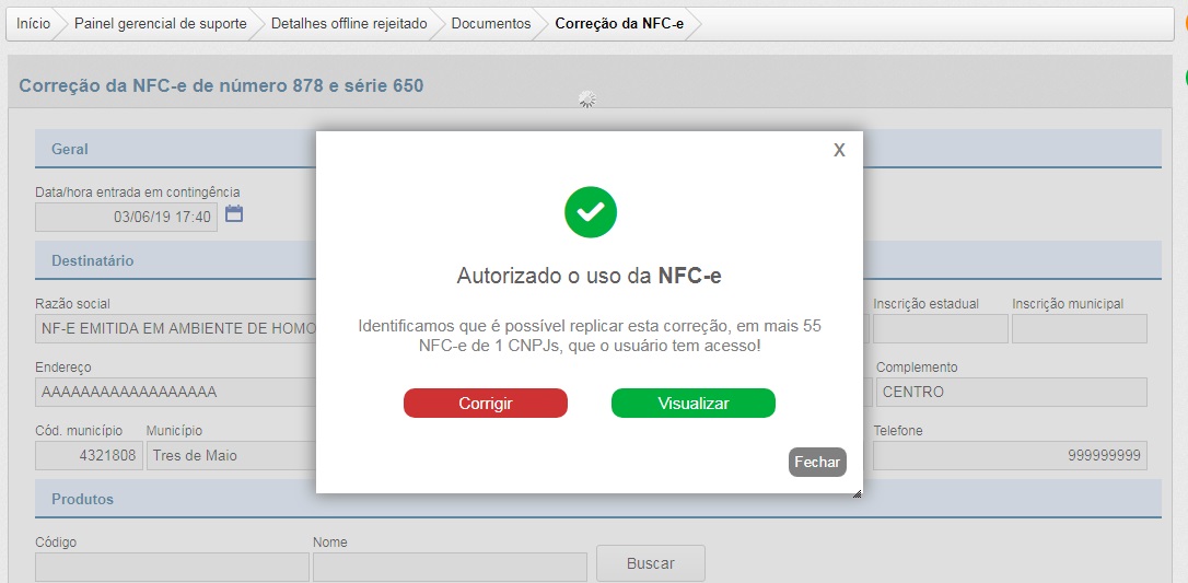 Após a correção da rejeição, a nota será reenviada e se autorizada, irá identificar outros documentos em que seja possível replicar esta mesma correção, onde a busca destes documentos segue uma regra específica para cada tipo de rejeição.