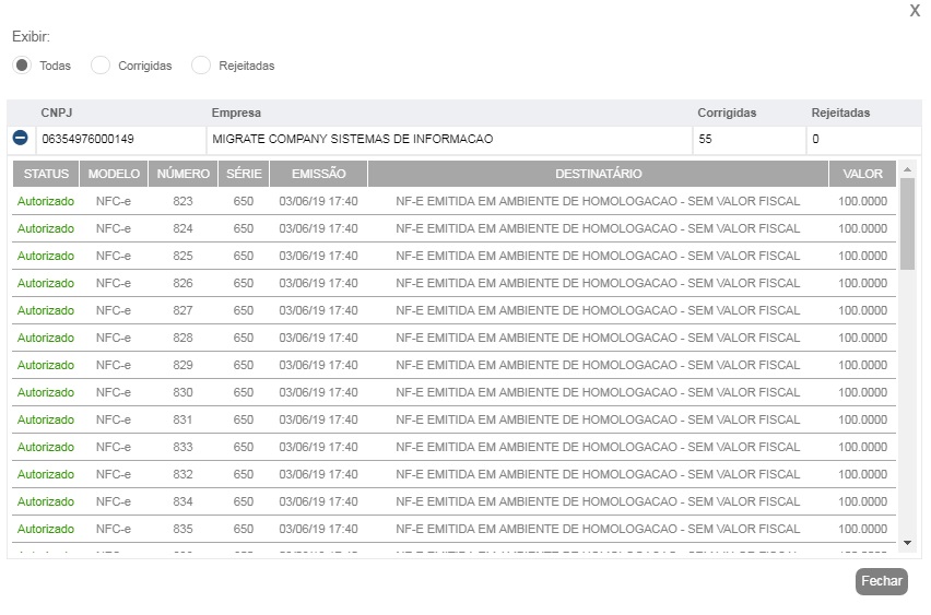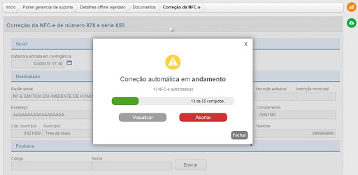 O processo ainda permite que o envio das notas seja abortado durante o andamento da correção, onde nesse caso somente irá validar os documentos que já foram processados. Após concluir ou abortar o processo, a opção Visualizar é liberada ao usuário.