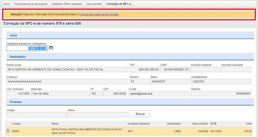 O processo de correção automática para documentos NFC-e rejeitados em contingência offline irá ocorrer para as seguintes rejeições: