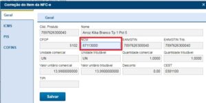 Ao selecionar o item a ser corrigido, o sistema abre a tela de correção, permitindo ao usuário informar o NCM correto, dando sequência ao processo clicando em Salvar.