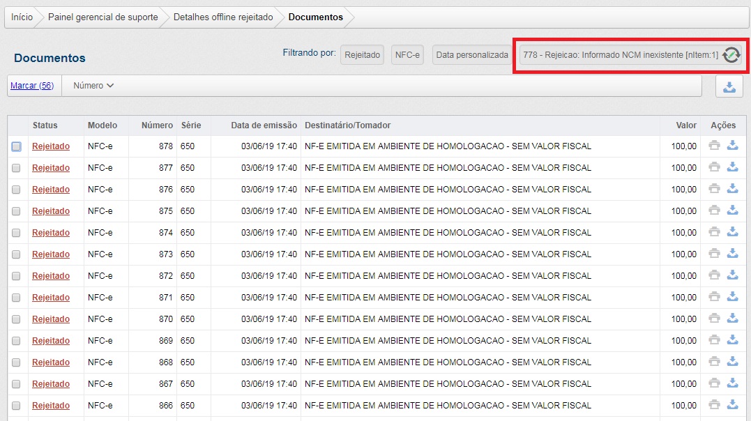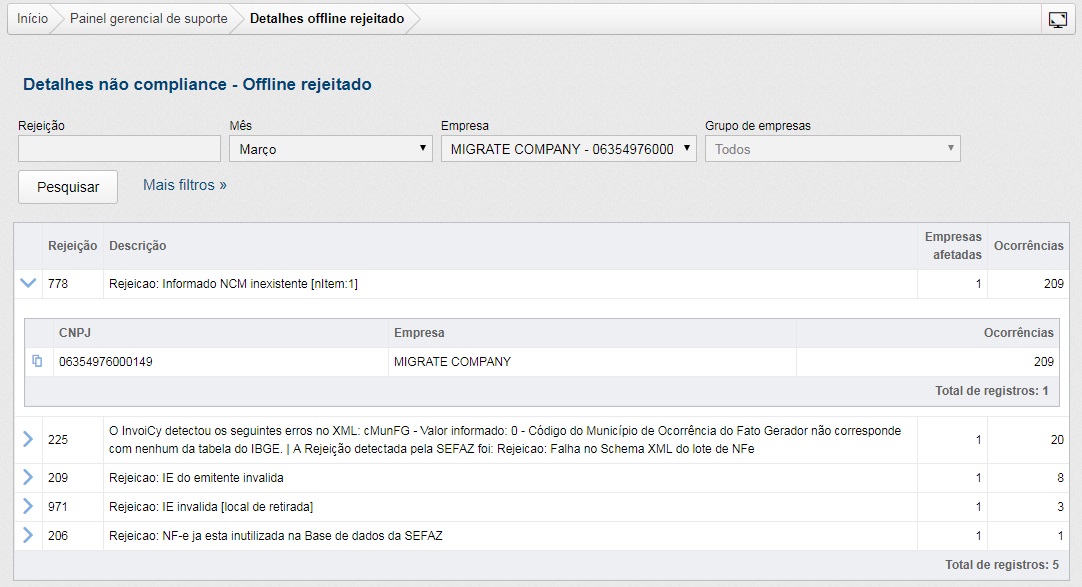 A ordem das rejeições é decrescente pelo volume de incidências e também apresenta o volume de CNPJs afetados por cada rejeição. Assim, a empresa específica selecionada apresenta apenas os documentos relacionados a essa rejeição.