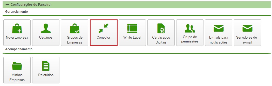 Para isso basta acessar no grupo Configurações do Parceiro, no Painel de Controle, a opção Conector, como demonstra a imagem a seguir.