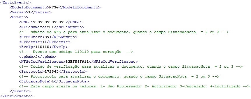 Se a nota não existir no sistema da prefeitura, o ERP deverá enviar ao InvoiCy o mesmo evento de correção apresentado anteriormente, porém enviando o campo NotaExiste como “N”,  nesse caso não devem ser enviadas as tags Protocolo, NFSeCodVerificacao e NFSeNumero.