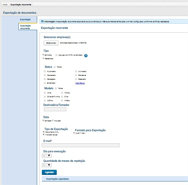 11092 – Formato do arquivo na exportação recorrente: foi ajustado o processo de exportação recorrente, disponibilizando a opção de exportação de arquivos também no formato xls e csv.