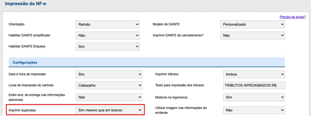 Esse novo parâmetro também pode ser configurado no cadastro de empresas via web service. Para isso, é preciso informar a tag <ImprimirDuplicatas> com o valor ‘SB’, no grupo de parâmetros de impressão do módulo NF-e.