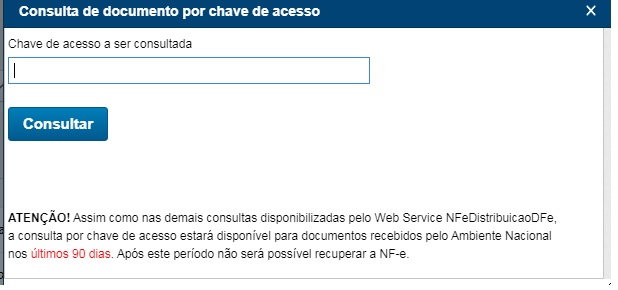 Assim como nas demais consultas disponibilizadas pelo Web Service NFeDistribuicaoDFe, a consulta por chave de acesso estará disponível para documentos recebidos pelo Ambiente Nacional nos últimos 90 dias. Após este período não será possível recuperar a NF-e.