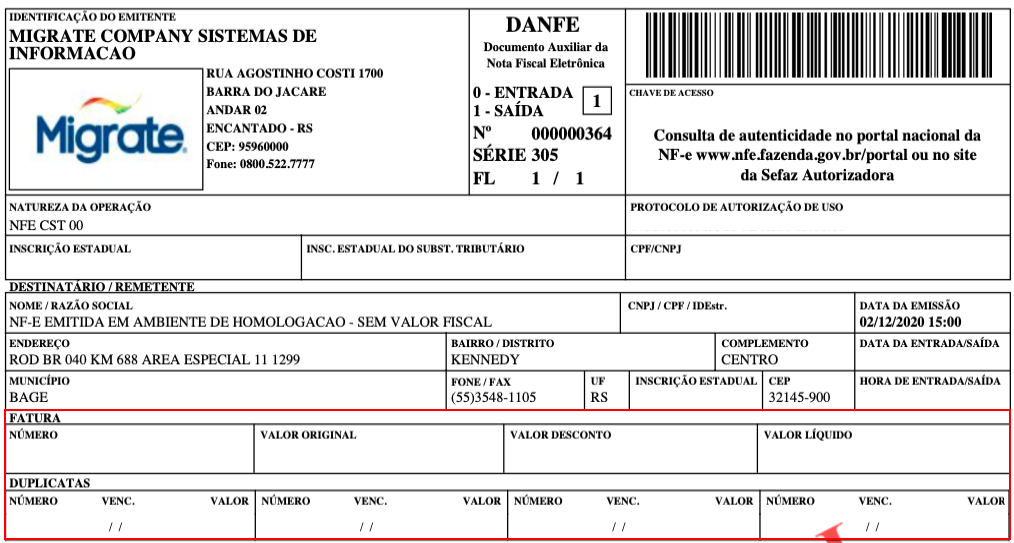 Ao enviar uma NF-e sem preencher as informações de fatura e duplicatas, será possível imprimir no DANFE o quadro correspondente, mesmo sem nenhuma informação.