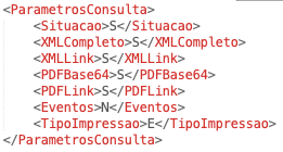 Mas atenção! Para isso é necessário enviar nos parâmetros da consulta as tags PDFLink e Eventos preenchidas com o valor ‘S’, como demonstra a imagem abaixo, caso contrário o link do PDF do evento não será retornado.