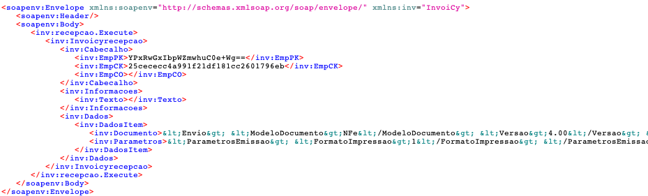 Apresentamos aqui um exemplo do envio informando os parâmetros, utilizando a ferramenta SOAP UI: