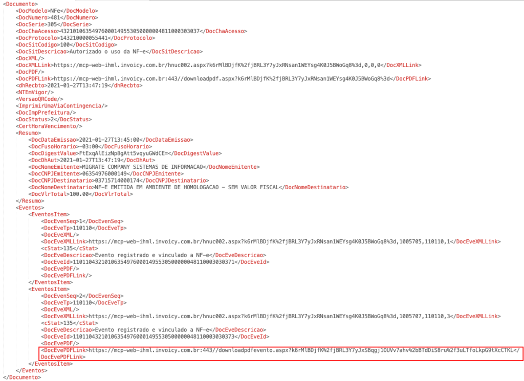 No exemplo abaixo a NF-e consultada possuía duas cartas de correção vinculadas, e como é válida sempre a última CC-e enviada, retornou o link do PDF apenas da CC-e de sequencial 2.