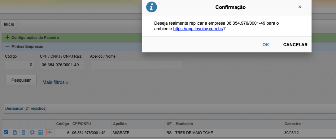Dessa forma, basta clicar no ícone correspondente a empresa que você deseja enviar o cadastro para o outro ambiente, onde o sistema irá apresentar uma mensagem em tela, solicitando a confirmação para replicar o cadastro da empresa.