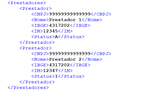 Em situações onde há a necessidade de cadastrar vários prestadores para uma ou várias empresas, o InvoiCy oferece a possibilidade de enviar uma estrutura XML própria, que deve ser enviada ao Web service arecepcao.aspx. Conforme exemplo a seguir.