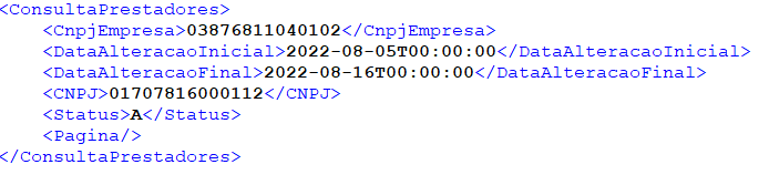 Para consultar os dados de prestadores específicos ou obter uma lista com todos os registros, é preciso enviar a seguinte estrutura XML para o web service arecepcao.aspx: