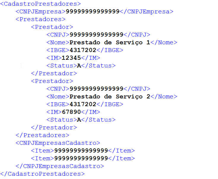 - o grupo CNPJEmpresasCadastro deve ser preenchido com o CNPJ da empresa à qual o prestador será vinculado. Para vincular à mais empresas é preciso replicar a tag <Item>.