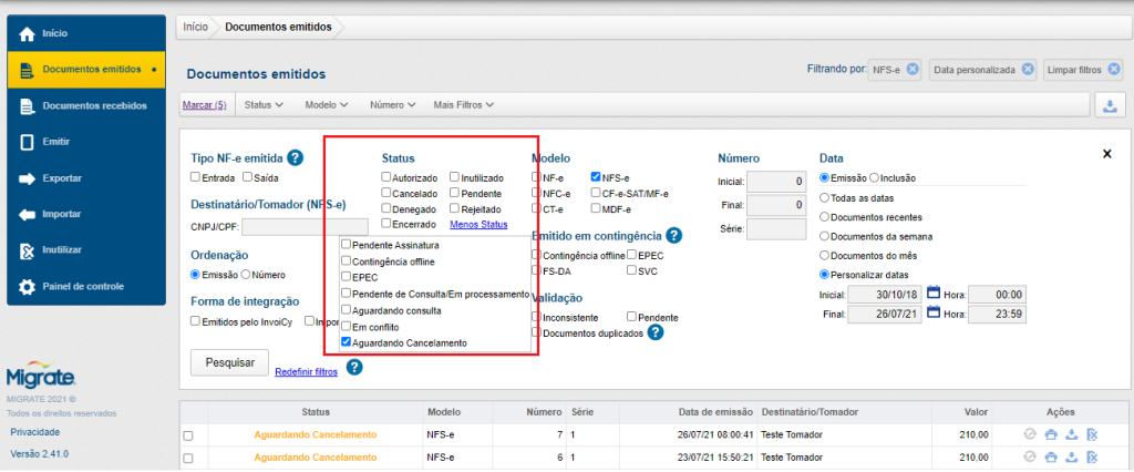 A exportação de documentos via tela também passa a considerar o novo status “Aguardando Cancelamento” nos filtros para busca de documentos.