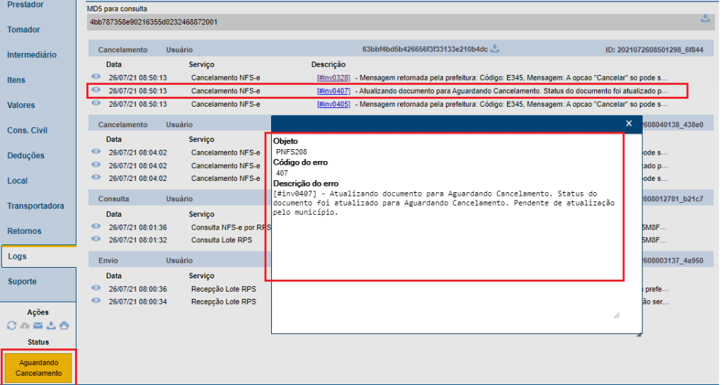 Dentro da tela dos Logs, foi adicionado o novo Log, informando que o status foi alterado para “Aguardando Cancelamento”.
