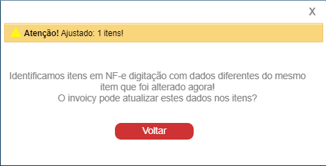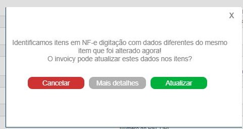 Com a nova versão do InvoiCy, o usuário poderá alterar os dados do item, o sistema irá efetuar a busca nas NF-e em digitação e possibilitar a atualização do item. Conforme a figura abaixo, pode-se verificar o popup que irá aparecer caso seja efetuado a alteração dentro da tela de digitação.